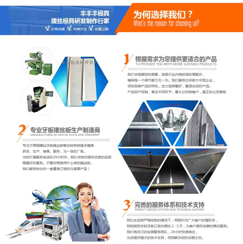 我們始終抱持著勤、誠、信的原則,致力于螺絲牙板、搓絲板產(chǎn)品專業(yè)廠商。多年來,由于全體同仁的勤奮、誠樸與使用客戶的支持與信任。造就三豐牙板品牌在業(yè)界樹立的良好形象,也建立了品質(zhì)保證的優(yōu)良信譽(yù)。勤、誠、信是三豐牙板全體同仁共同遵循的中心理念,更是我們服務(wù)客戶的宗旨。主營產(chǎn)品:不銹鋼搓絲板,不銹鋼機(jī)絲倒角切平牙板,D/W雙線單出(ss)墻用細(xì)牙搓絲板,機(jī)絲束桿圓尾牙板,機(jī)絲帶圈位螺絲牙板,高低牙自攻牙板,機(jī)絲帶溝五溝牙板,不銹鋼扭花紋搓絲板,牛仔釘牙板,直齒搓花板等搓絲模具。產(chǎn)品可滿足國標(biāo)(GB)、德標(biāo)(DIN)、美標(biāo)(ANSI)、日標(biāo)(JIS)、國際標(biāo)準(zhǔn)(ISO)等各種國際通用標(biāo)準(zhǔn),并能根據(jù)客戶實(shí)際要求,設(shè)計(jì)訂做各種特殊非標(biāo)規(guī)格...